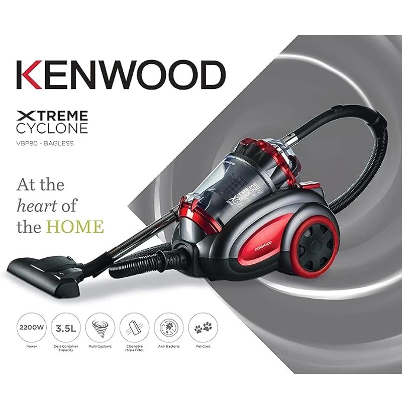 The Kenwood 3.5 Litre Extreme Cyclone Bagless Vacuum Cleaner VBP80.000RG delivers powerful and efficient cleaning performance with its 2200-watt motor and advanced cyclonic technology. This vacuum cleaner is designed to tackle various cleaning tasks with ease, making it an ideal choice for maintaining a clean and healthy home.